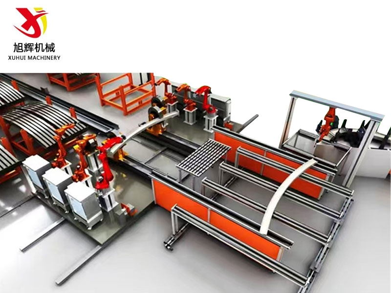 工字钢经数控冷弯机精 准弯制成型后,由运输平台自动对齐并送达焊接区。两台连接板自动对接机器人精 准拾取连接板并固定定位,四台焊接机器人依次完成点焊、翻转焊接作业,翻转平台自动配合实现双面焊接,整个过程行云流水,单节钢拱架加工快仅需5-8分钟。